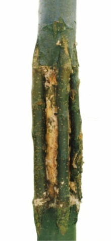 Sur la baguette, taillez en biseau de chaque côté et du même côté. Sur le côté opposé à l'écorce soulevée,enlevez une fine pellicule d'écorce sur le greffon pour faire apparaître le cambium.- Mettre la baguette dans le sens de la sève.