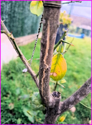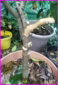 Les écorces sont fendus sur les tiges du greffon : Porte-greffe trop jeune, souvent un poncirus trifoliata, avec une météo pluvieuse. L’écorce peut se fendre sur les tiges fines du greffon. Mettre de l’argile blanche sur la fente ou de la bouillie bordelaise avec de l’eau ou à défaut, voir les produits de cicatrisation. Au printemps prochain, taillez ces branches avant les fentes, avec un sécateur désinfecté. (Merci à Olivier Biggio pour l’information)