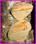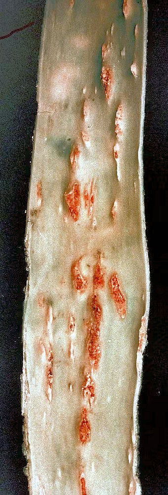 En sur une coupe de branche on voit une coloration orangée due au champignon dans le système vasculaire. Sur les bois secs, cette coloration est noirâtre.