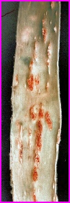 Les feuilles sont tachées de points marrons ou noirs plus ou moins grand surélevés et rugueux au toucher .